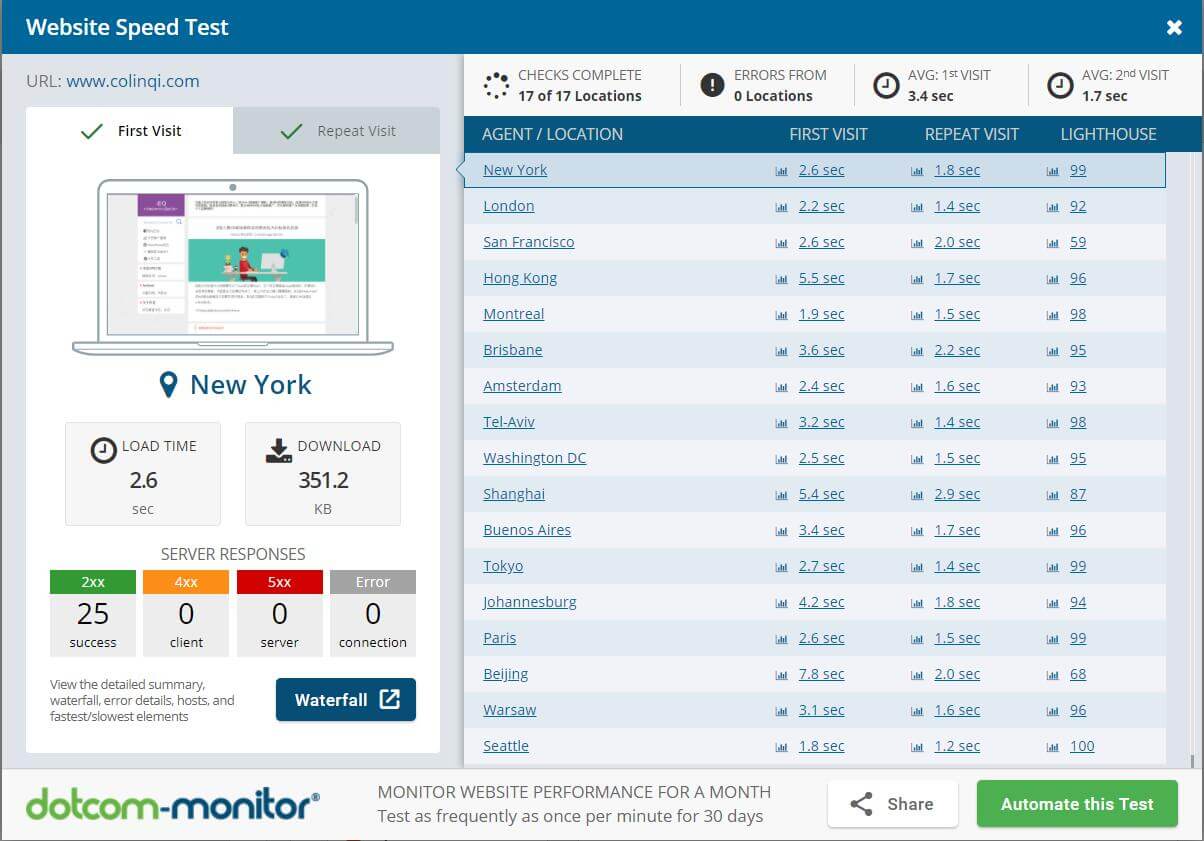 可以从全球20个不同的地方来测试网站,包括基于云的测试(亚马逊-美国-东方)和从中国防火墙后面(中国上海)。一旦测试完成,用户可以选择“细节”,深入健壮的性能报告和瀑布图分析。用户也可以选择他们想要测试的浏览器。这个测试支持Chrome,Firefox,IE &手机浏览器包括iPhone,iPad等!Dotcom-Tools正在不断开发性能工具,以帮助用户、站长和开发人员改善他们的网站和他们的网络体验。