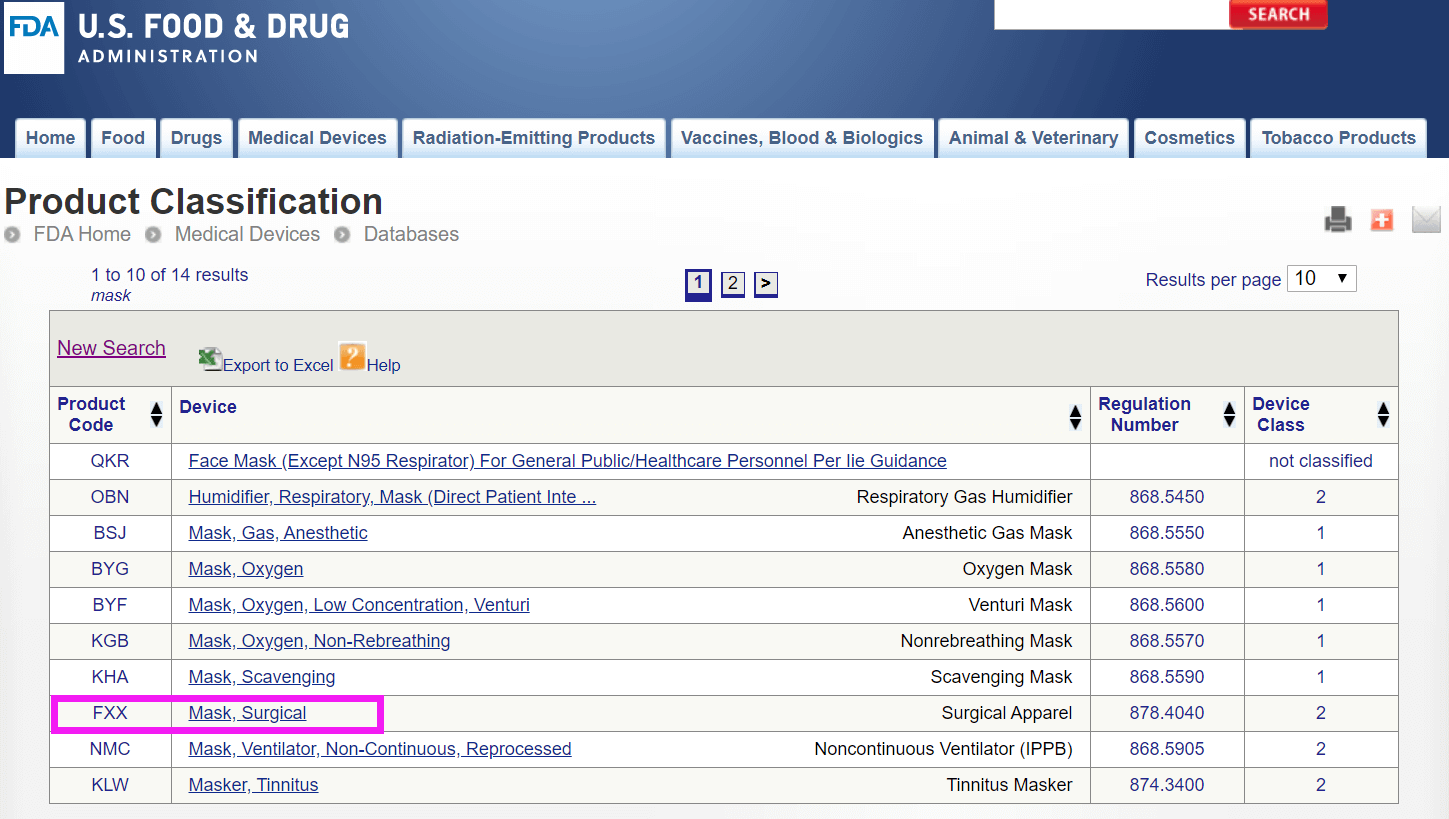 依据关键词" Mask ",进行搜索: 选择最合适的代码:FXX,依据FDA指南编写510k报告,提交美国FDA审批。