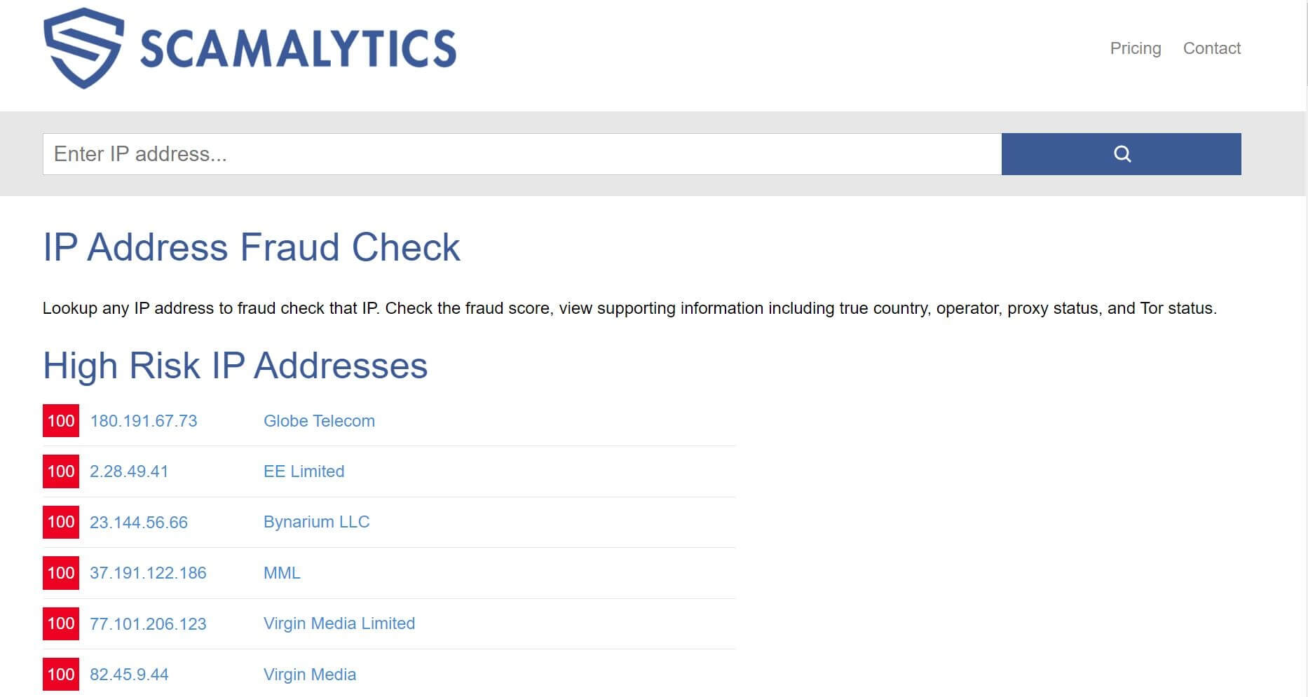 scamalytics可以查找任何IP地址是否有IP欺诈可能。提供检查欺诈得分,查看支持信息,包括真实的国家/地区、运营商、代理状态和tor状态。